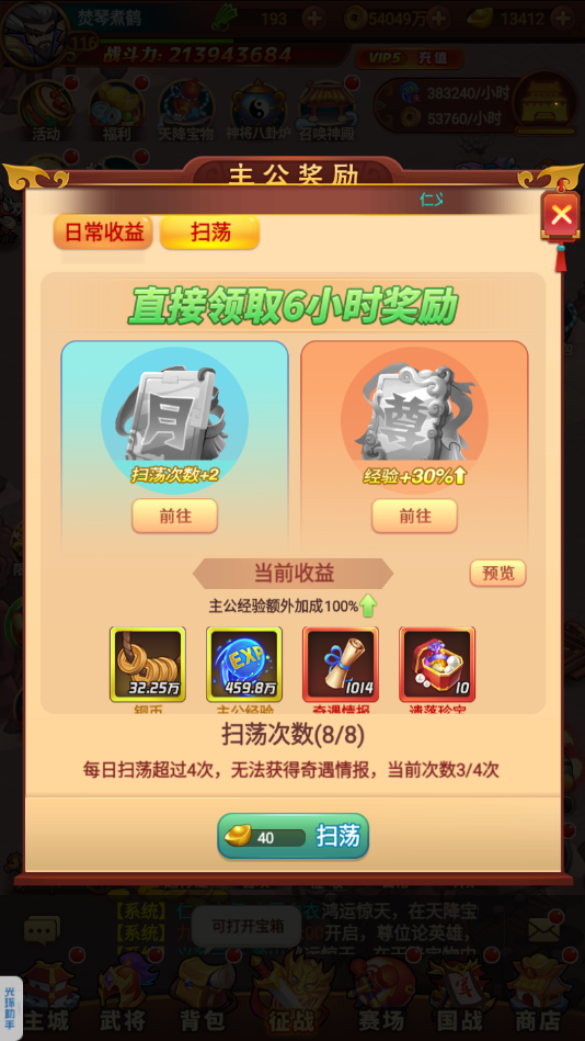 1、扫荡功能:扫荡可以直接获得经验值,每天第一次扫荡是免费的,后续扫荡需要花费元宝才可以,不过消耗的数量并不多。