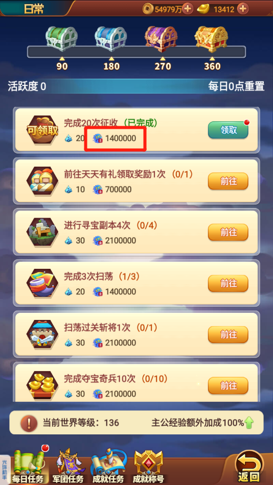2、每日任务获取的经验值也是和等级挂钩的,因此挂机获取、每日任务、征收系统这三个要结合起来、
