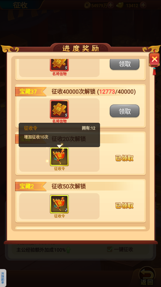 2、征收次数达到一定数量之后还能额外得到经验值和征收令,一个征收可以兑换是个征收次数。游戏前期的等级作为重要,因为玩家到达80级的时候就能用上赵云了,因此在这个时候征收令是一定要全部用上的,并且征收次数一定不能到达上限。