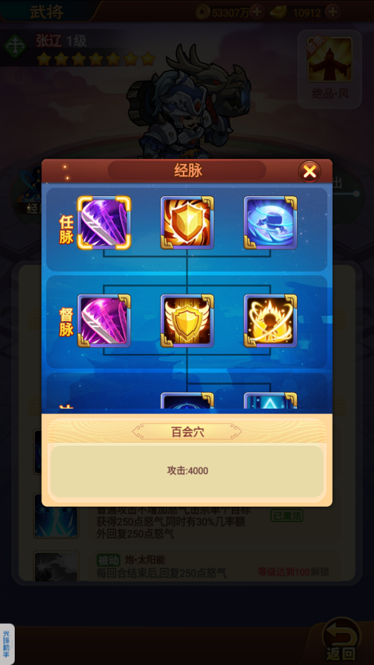 (1)任脉:百会穴攻击力+4000、神庭穴护甲力+600、太阳穴生命值+3000。
