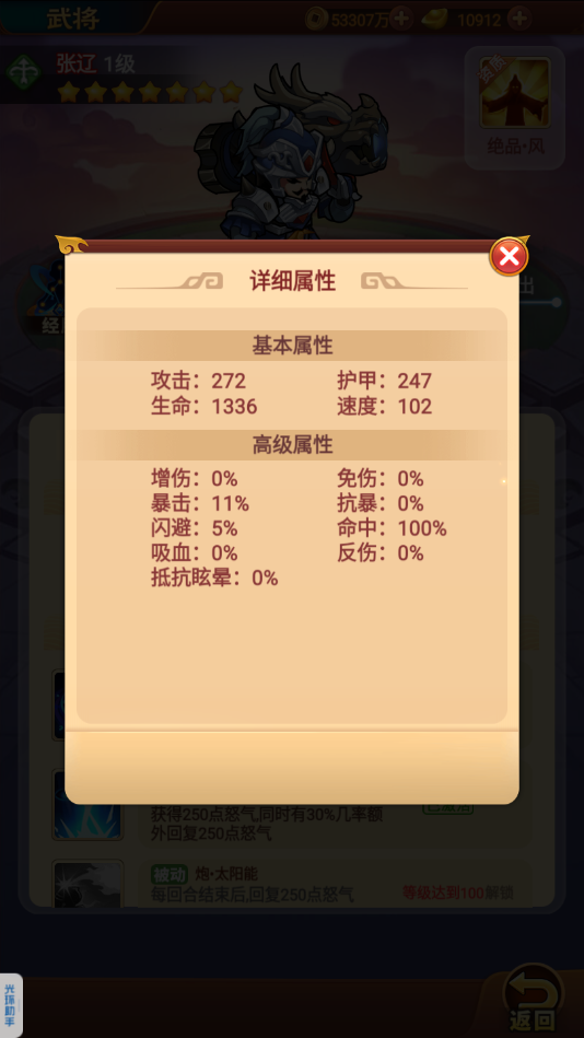 (3)高级属性:增伤0%、暴击几率11%、闪避几率5%、吸血0%、抵抗眩晕0%、免伤0%、抗暴0%、命中100%、反伤0%。