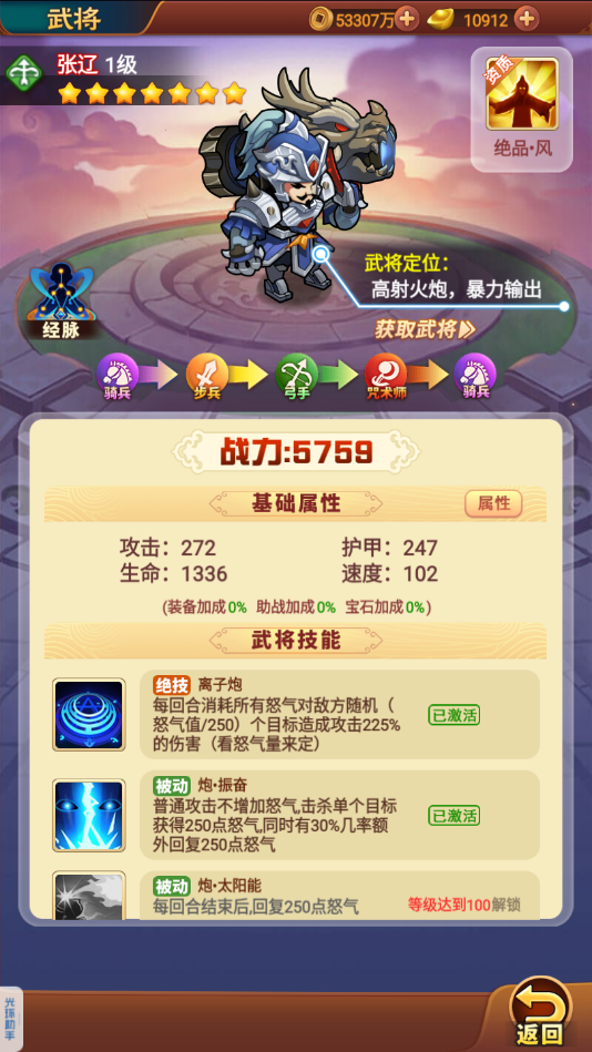 (1)绝技—离子炮:每回合消耗所有怒气对敌方随机目标造成攻击225%的伤害。