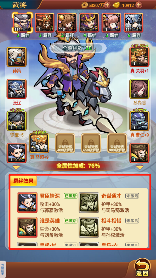 2、羁绊:羁绊系统和名将册有些类似,也是可以百分比增加属性的,但是羁绊系统的实用性更高,只要大家曾经得到过该武将,那么就能解锁这个羁绊效果,即使不上场也不上阵也是没关系的。