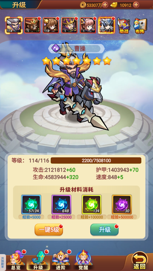 1、进阶:英雄进阶需要消耗同品质的武将,这一点还是比较方便的,即使是品质最高的七星红武将,获取渠道也不是很难的。