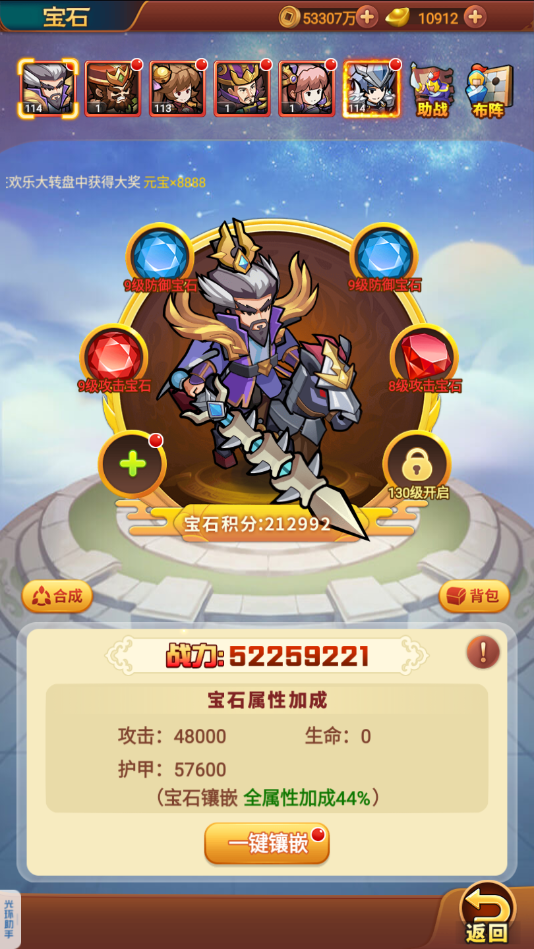 (3)宝石加成:每个角色最多携带六个宝石,宝石的位置是根据玩家的等级来解锁的,镶嵌合理的宝石可以带来大量的全属性加成。