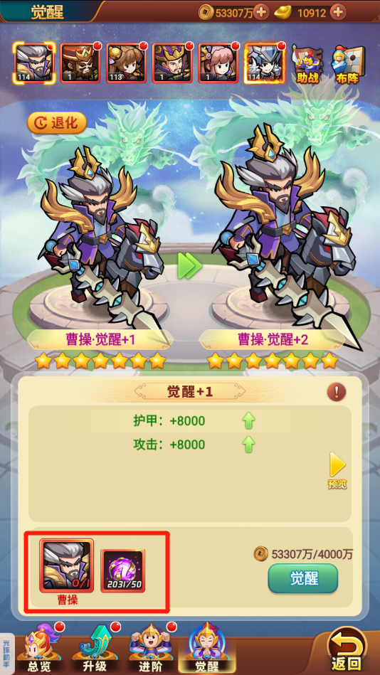 1、觉醒可获得神龙之力,提升大量武将属性。