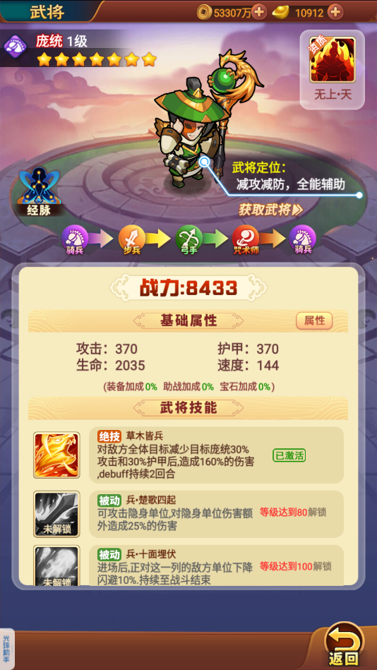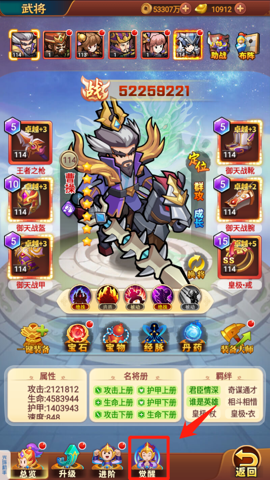 3、同武将:武将想要觉醒还需要消耗同角色才可以,那么庞统就是必不可少的了,不过玩家要记得培养过的武将不能作为党醒材料。