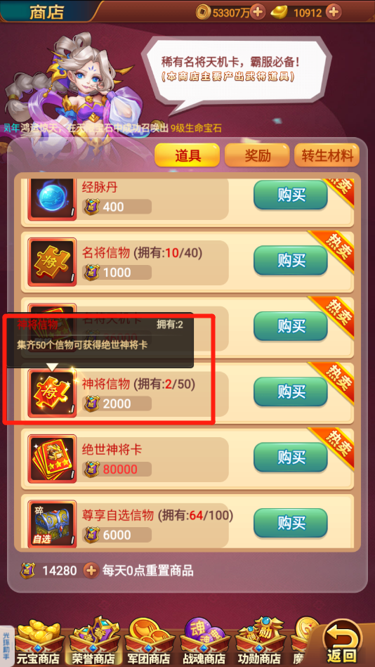3、每周商店:每周商店主要是VIP福利,不过奖励都还是好的,比较容易换出庞统,可以买的的话就不要客气了。