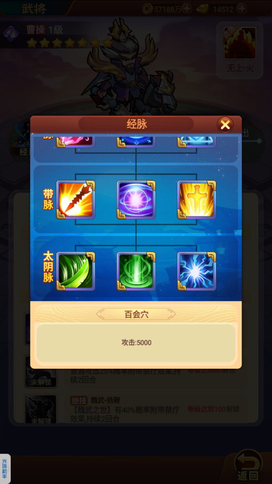 (3)冲脉:太渊穴普通攻击可以恢复造成伤害的60%血量;三阴穴普通攻击有50%几率减少敌人攻击力15%,效果持续三回合;太白穴普通攻击禁止治疗概率从30%提升到35%。