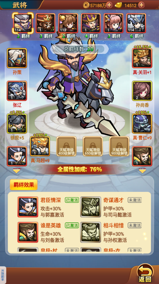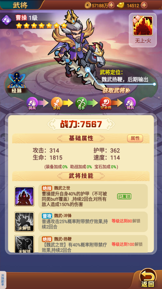 (1)角色特性:初始七星角色,无上·火生命提升10%,命中提升8%,属于骑兵阵营克制步兵,被咒术师所克制。
