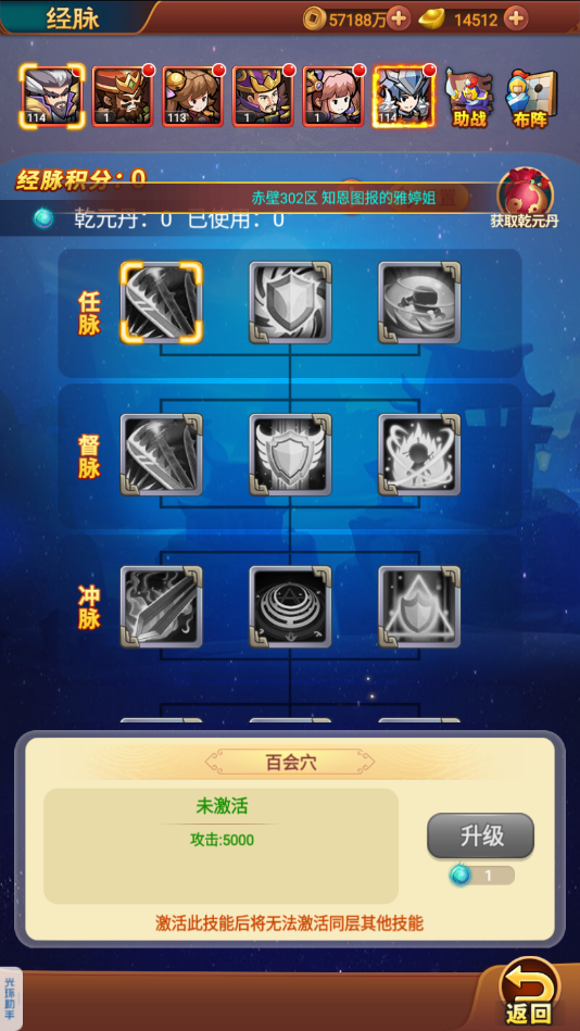 (2)督脉:膻中穴进入战斗后提升自身暴击几率10%,效果持续2个回合;巨阙穴速度增加30;商曲穴进入战斗后提升自身命中几率10%,效果持续2个回合。