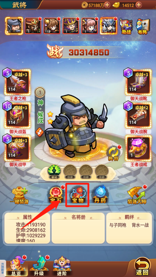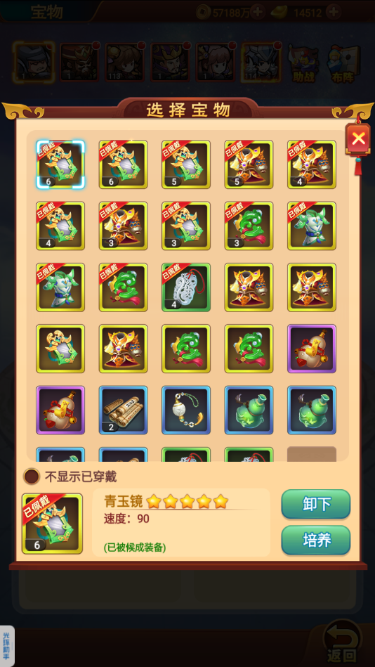 (2)输出武将:一般的普通玩家和小氪玩家都是主力培养一个输出武将的,因此输出类型的宝物都要优先给主武将。那么暴击几率、攻击力百分比就是最重要的,也可以配置一定数量的速度宝物来增加出手速度,不用配置的太高,根据情况而定。