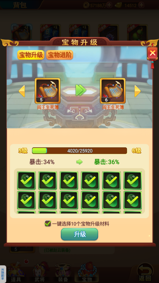 (4)特殊宝物:闪避几率这个宝物属于是比较特殊的了,在自身闪避不高的情况下可能看不出闪避的作用,但是部分有闪避特性的武将就不一样了,累积大量的闪避值可以做到非常高的MISS几率。也有一个小技巧比如大家卡在了某个关卡过不去,那么可以尝试给主前排佩戴上全闪避,总来来说是个投机取巧的方法,不过只要以自残式这样是有几率过关的。