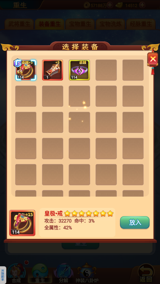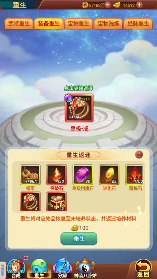 (2)重生类型:游戏中一共有五项资源可以重生,分别是武将重生、装备重生、宝物重生、宝物洗炼、经脉重生。