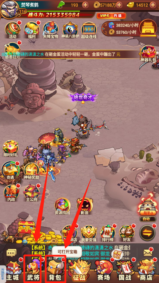 2、操作界面2:也可以在到游戏中的主页面点击左下方位置的“武将”按钮,点击武将身上的装备同样可以进行的“培养”操作。