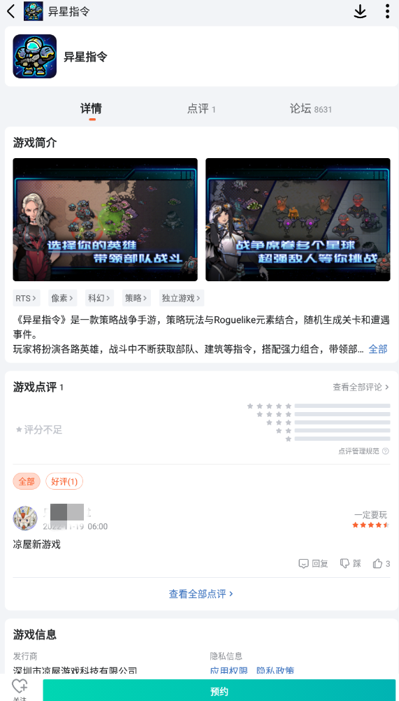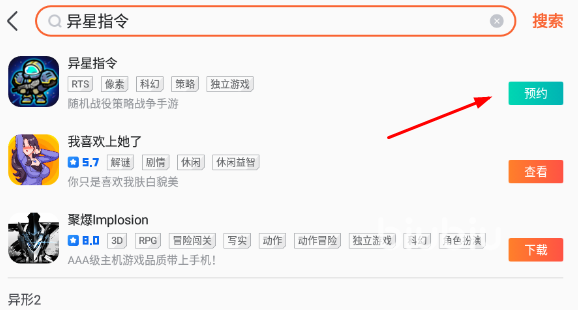 点击上方的游戏链接,进入九游异星指令专区,然后点击蓝绿色预约的按钮,即可简单预约游戏。