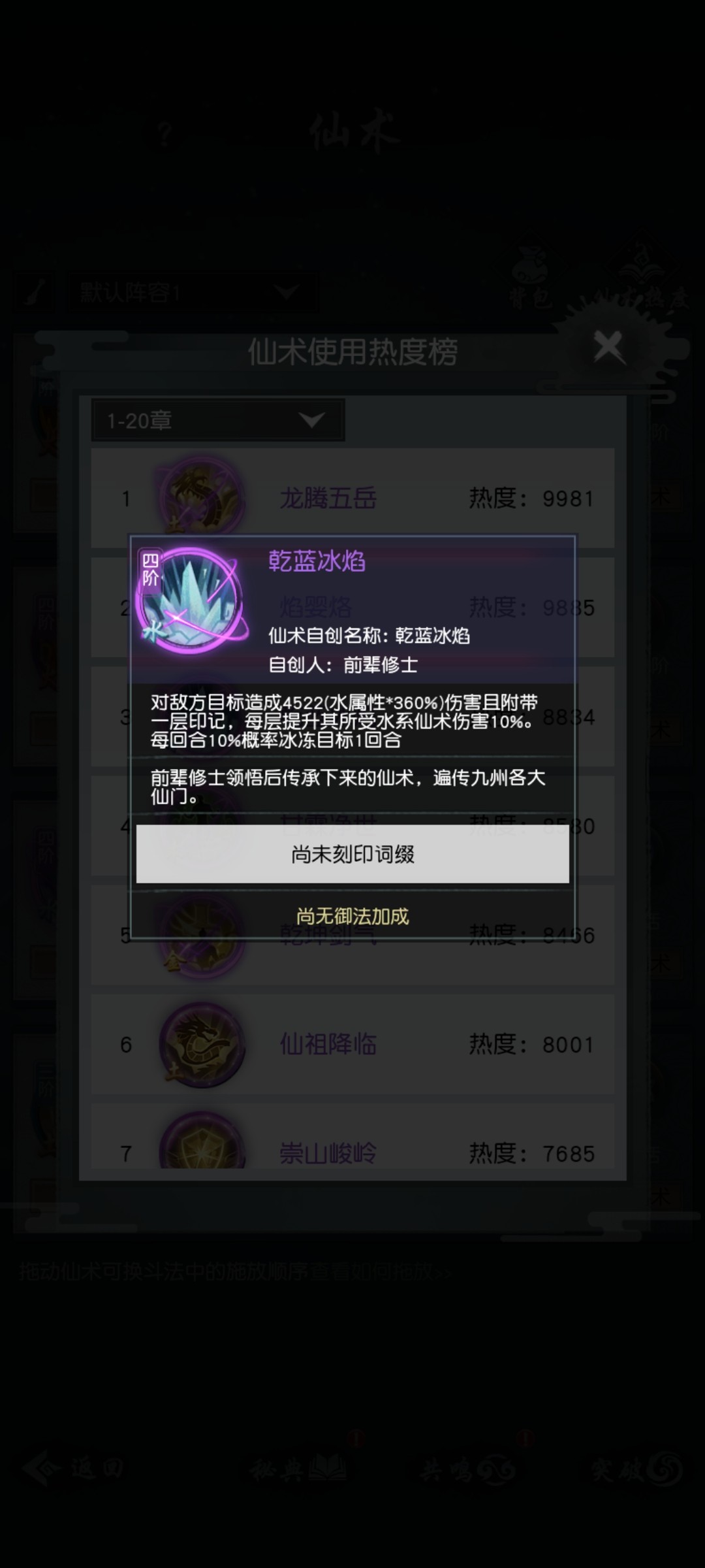 水属性紫色法术:乾蓝冰焰:对敌人造成水属性*360%的伤害,附带印记,每一个印记可以提高敌人受到水属性伤害的10%,并且有概率冰冻敌人。有良好的伤害和控制效果。