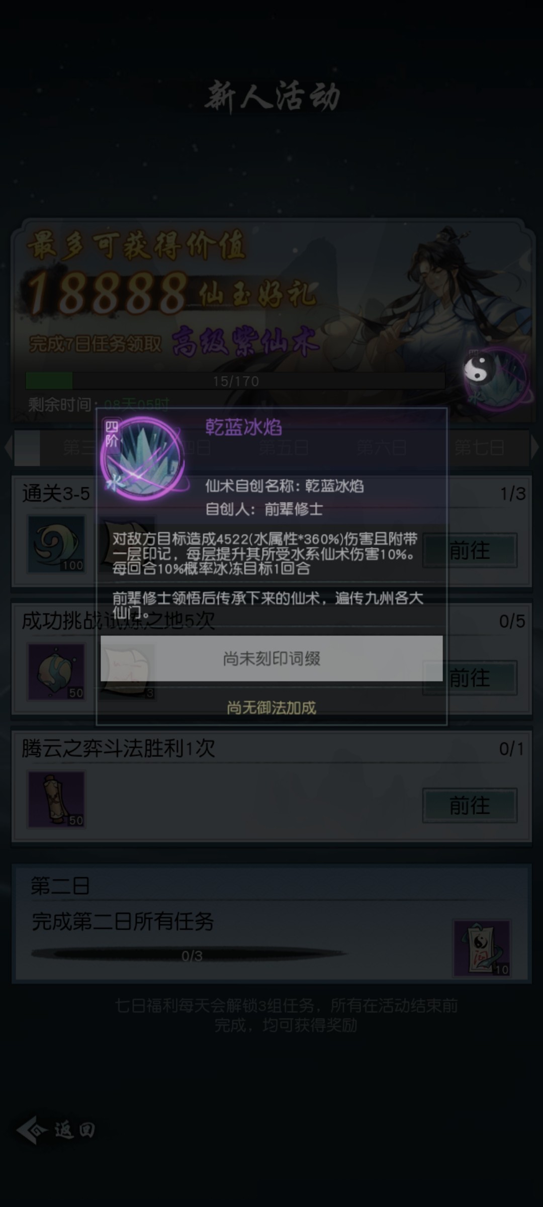 剩下几天的任务也和这些任务类似,玩家们推副本、参加斗法、进行试炼、提升灵气等等,当我们完成这些任务最后获得170积分的时候,就可以获得最终大奖:乾蓝冰焰!这个是四阶的水技能,可以对敌人造成水属性*360%的伤害,并且附带印记,每一层可以增加10%的伤害和冰冻概率!可以说是非常强悍的技能。因此玩家们一定要努力完成这个任务。