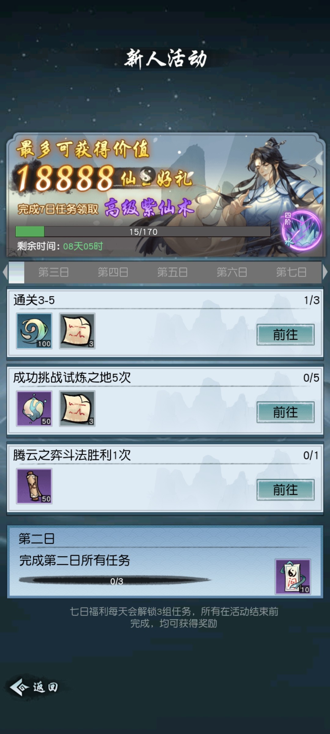 第二天需要我们的通关3-5、挑战试炼之地、斗法胜利等任务,完成任务我们可以获得会券、五灵之气等等。