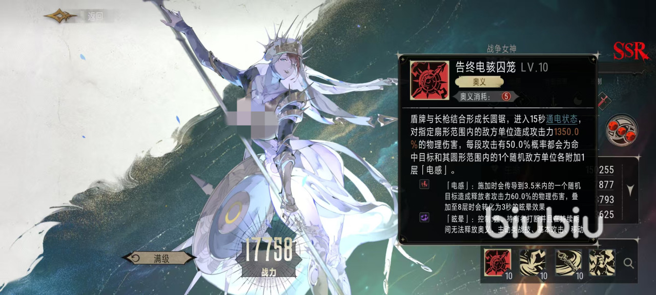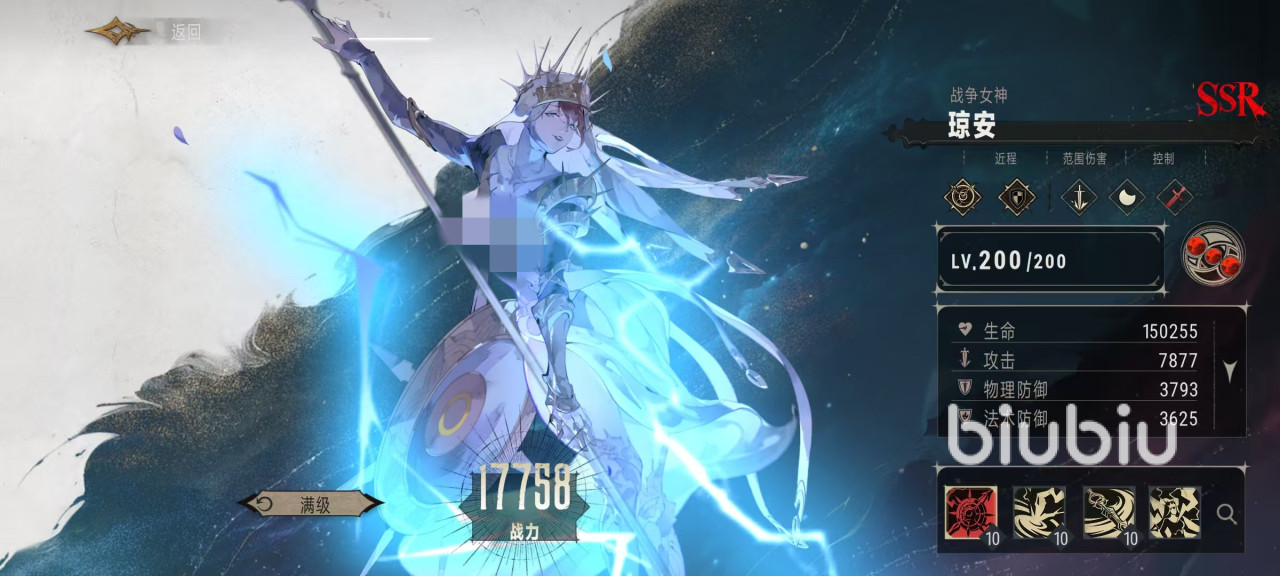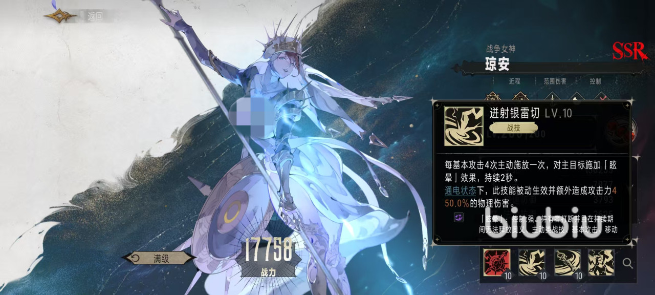 奥义技能对指定扇形范围内的敌方单位造成1350%攻击力的物理伤害,每段攻击还有50%几率为命中的目标和其圆型范围内的一个随机单位各附加一层电感。可以说开启奥义技能之后的琼安,将真正化身为战争女神,在场上疯狂输出,打出高额范围伤害和控制效果,绝对是目前最值得选择的核心主c之一。