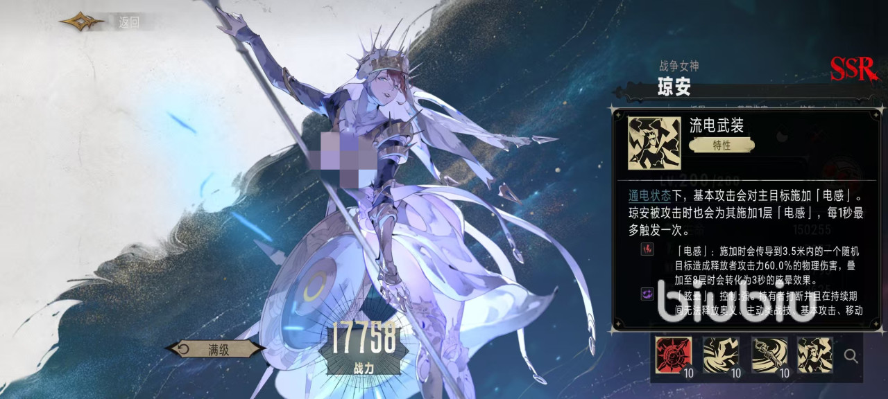 在自身特性流电武装的影响下,通电状态下基本攻击会对目标施加电感,琼安被攻击时也会对伤害来源施加一层电感。这个效果每一秒钟最多触发一次,电感的效果是施加时会传导到3.5米内的一个随机目标,造成60%攻击力的物理伤害,叠加到8层时转化成长达三秒的眩晕。自身奥义技能,使用盾牌和长枪结合成长圆锯,接下来就会进入到长达15秒的通电状态,这样无论是普攻、战技还是特性就都触发了出来。