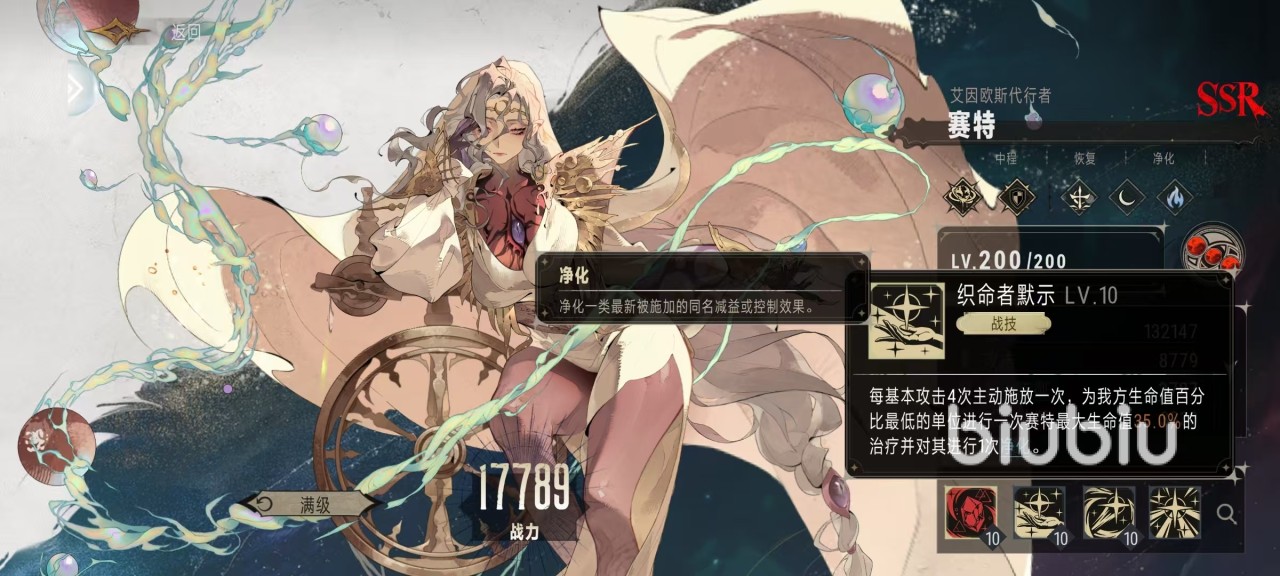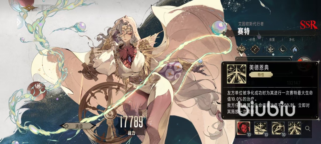 自身的战技效果是每进行4次普攻,就可以主动释放一次,为我方当前生命值百分比最低的单位进行一次治疗,按照赛特最大生命值的35%来计算治疗数值,能对其进行一次净化。净化可以将目标身上的减益或者是控制效果清除掉。这个战技除了普攻4次触发之外,还可以按照自身特性,有额外触发次数,这样在单体治疗方面就变得非常强势了,每一次都可以恢复大部分血量。因为战技本身就带有着净化效果,所以完全可以触发特性治疗,两个技能累积起来一共有45%最大生命值的治疗效果。