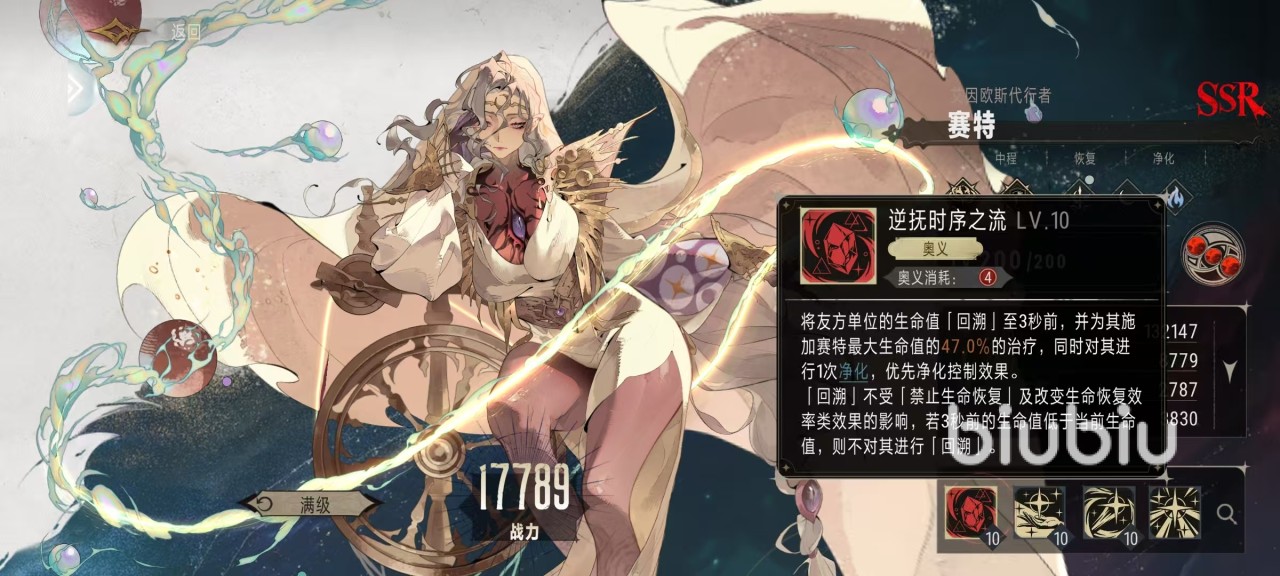 奥义技能效果是将友方单位的生命值,直接回溯到三秒之前的状态,并为其进行一次赛特最大生命值47%的治疗。同时进行一次净化,会优先进化掉身上的控制效果。要注意的是回溯不会受到禁止生命回复的影响,如果三秒前生命值低于当前血量,那么不会进行回溯。所以大家根本不用担心这个技能不小心使用失误而出现血量更低的情况。