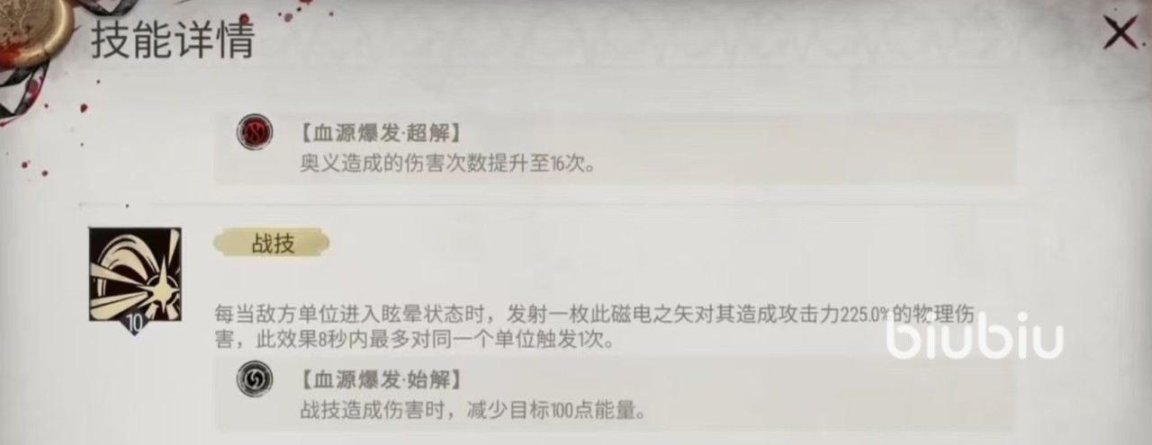 自身的战技,每当敌方有单位被眩晕,就会发射出一枚磁电之矢,对目标造成225%攻击力的物理伤害。8秒之内该效果只能对同一个单位触发一次,在战技造成伤害时还会额外减少目标能量。这样战技就和普通攻击以及特性一起叠加起来,实现了一个比较不错的输出循环,既有控制又有伤害。奥义技能可以对总目标半径2.5米范围内的随机敌方单位发射,磁电之矢,造成共计12次物理伤害,每次伤害都会附加一个电感,此伤害视为基本攻击伤害。这里所附加的电感是和之前附加的完全相同,另外在血缘爆发时,奥义造成的伤害次数可以提升至16次。