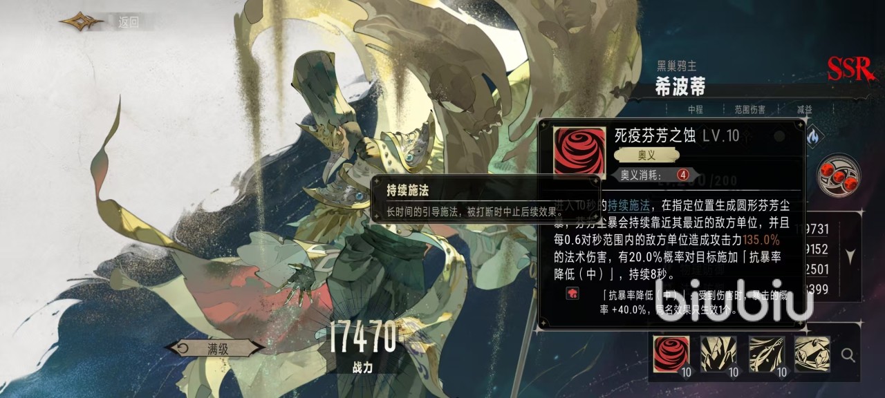 战技尘世心律,每10秒钟就会被动触发一次,对主目标和奥义追踪目标造成攻击力300%的法术伤害。所以这个战技的作用也是和奥义技能联系在一起的,它所具有的奥义技能是死疫芬芳之蚀,使用后进入到10秒的持续施法时间。在指定位置形成一片圆形的芬芳尘暴、芬芳尘暴会持续靠近距离最近的敌方单位,每0.6秒钟,就可以对范围内的敌方单位造成135%的法术伤害。过程中还有百分之二十几率对目标施加抗暴率降低效果,持续8秒钟。