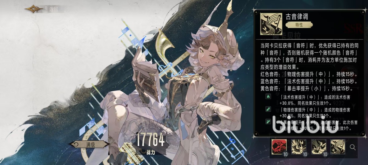阿卡贝拉是属于游戏中的远程增益型角色,它可以通过不同技能辅助队伍进行作战,月相为残月。普通攻击可以对目标造成法术伤害,战技是圣音弥撒,消耗音符时为友方单位进行治疗。,按照阿卡贝拉的最大生命值百分比来进行计算,生命值越高治疗的效果也就越好。音符是来自于自身的奥义技能银白镇魂曲,这个技能释放之后会进入到10秒的持续施法期间。