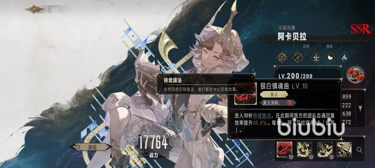 在这个期间是需要引导不能被打断,打断后终止后续效果。在持续施法期间,我方团队血魂恢复效率提升,每一秒钟阿卡贝拉就可以获得一个音符。而音符发挥作用主要依靠的是自身特性古音律调。当阿卡贝拉获得音符时,优先获得与持久的同种音符,否则会随机获得一个随机颜色音符。只要自身携带有三个音符时,就可以消耗掉来为友方单位施加对应类型的增益效果。注意这里的增益效果并不包括圣音弥撒所带来的治疗,治疗是单独进行加血。