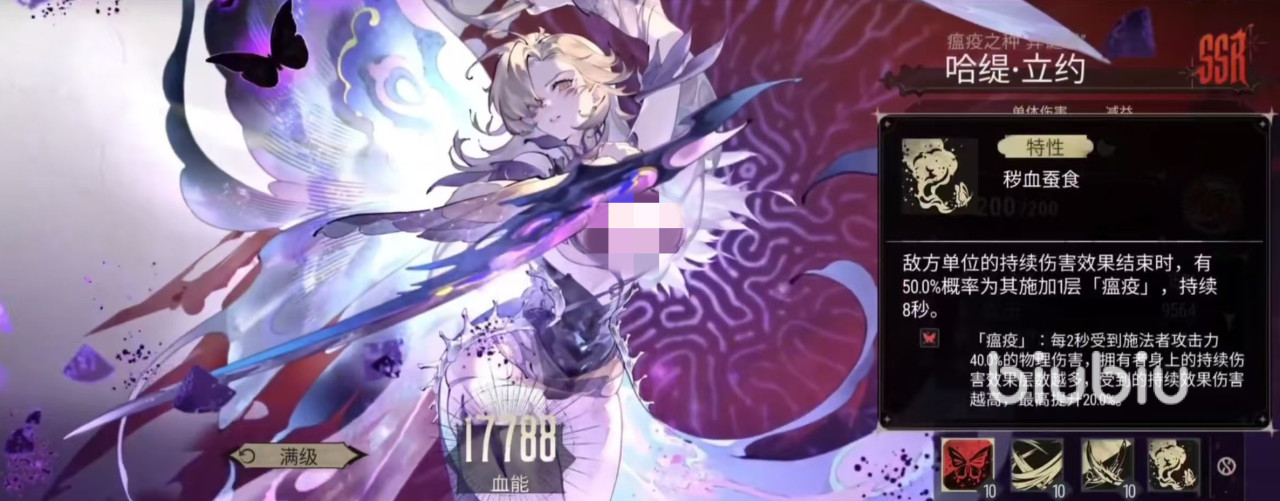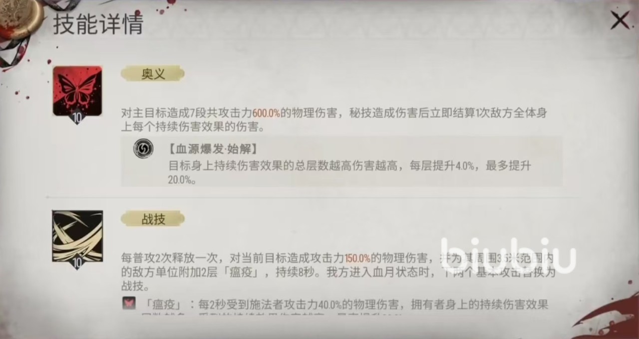 这里只要是敌方身上的持续伤害效果结束都有几率触发,例如流血或者是其他持续伤害都是如此。战技是每普攻两次就可以释放一次,对当前目标造成150%攻击力的物理伤害,同时为周围3.5米范围内的所有敌方单位,都附加两层瘟疫,持续8秒钟。我方进入血月状态时,下两个基本攻击会替换为战技。附加的瘟疫和上面所说的效果是完全一样的,所以哈缇立约本身也可以带来很高的持续伤害。