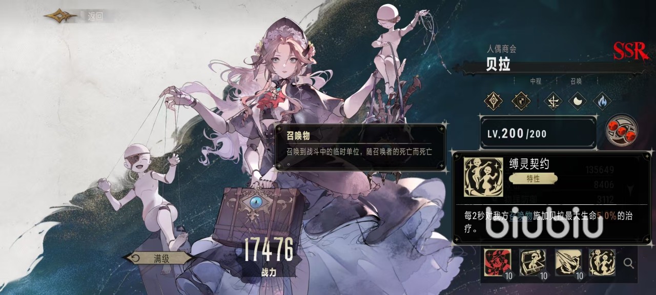 贝拉擅长在游戏中通过召唤来打出各种效果,它是属于夜族阵营中型角色,月像是残月。基本攻击对主目标造成204%的法术伤害,从基本攻击伤害比例来看,在所有角色中都是比较出色的一个。它的特性是缚灵契约,每两秒钟就可以对我方召唤物进行一次最大生命值5%的治疗,召唤物指的是我方所有上阵角色召唤出来的临时单位,召唤者死亡后,召唤物也会同样消失。