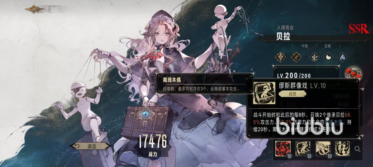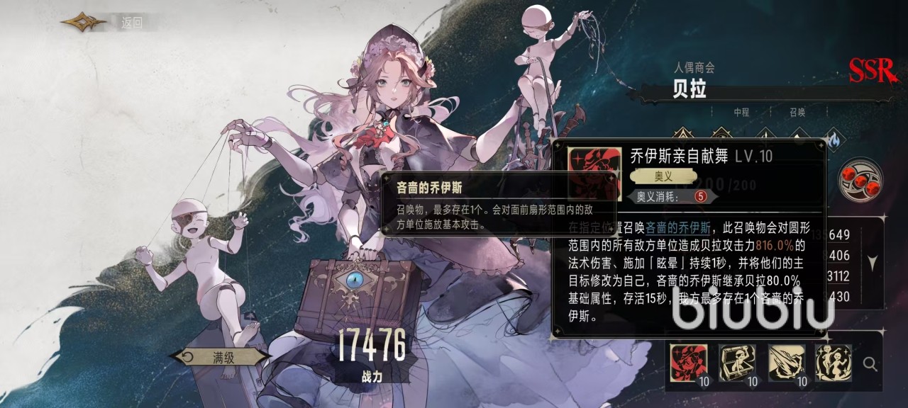 战技效果是在开始时,和此后的每8秒钟,都会召唤两个继承贝拉68%攻击力、68%防御力和生命值的离线木偶,持续20秒。提线木偶替代贝拉成为主目标,召唤物最多同时存在三个,会使用基本攻击来打出伤害。除了提高伤害之外还可以替代成为目标,这样对方在攻击的时候,贝拉的生存能力就会提升很多。自身的奥义技能效果是在指定位置召唤吝啬的乔伊斯,这个召唤物会对圆形范围内的敌方单位造成高额法术伤害,同时添加持续一秒钟的眩晕效果,将敌方单位的主目标修改成自身。吝啬的乔伊斯继承贝拉80%的基础属性,存活15秒钟,我方最多同时存在一个吝啬的乔伊斯。