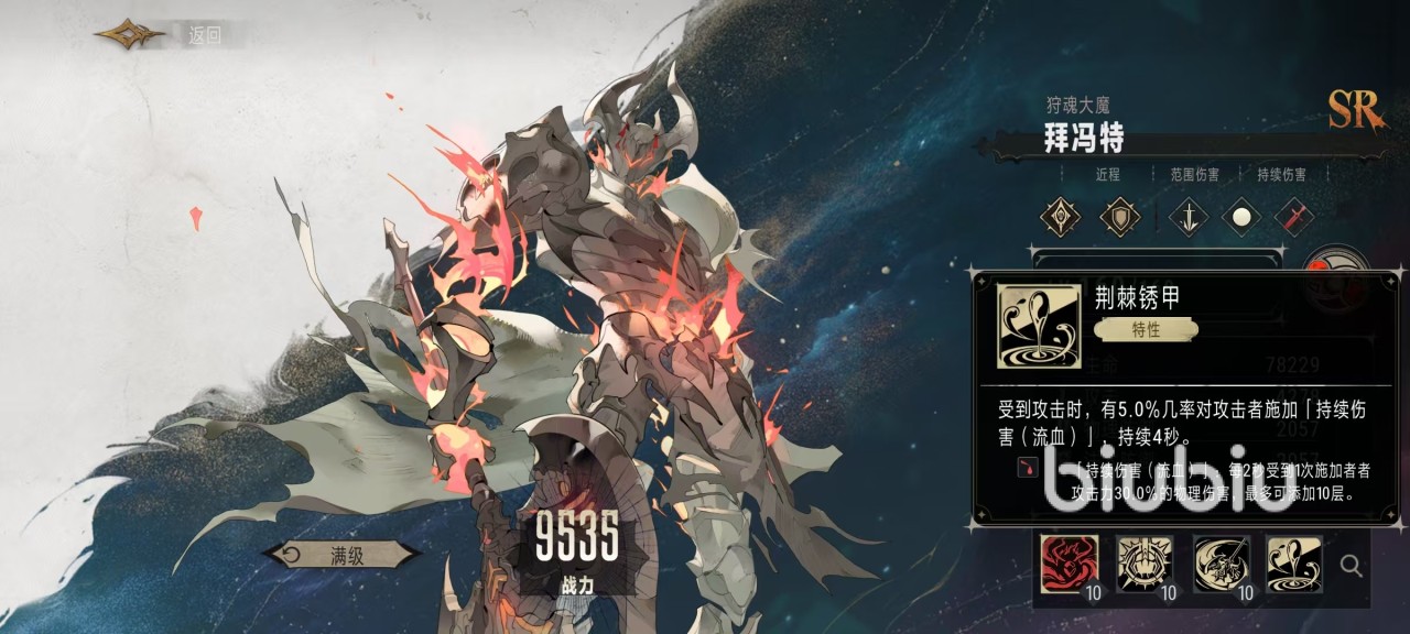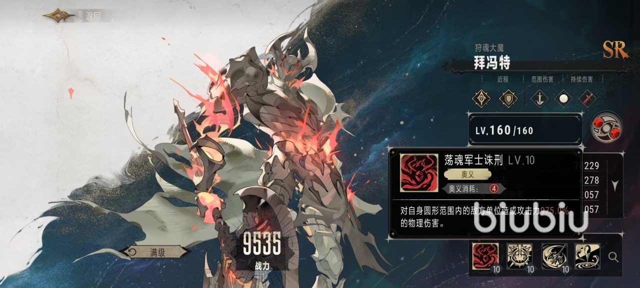 奥义技能荡魂军士诛刑,消耗4点奥义点数,释放之后对自身圆型范围内的敌方单位造成975%攻击力数值的物理伤害。这个奥义技能使用出来可以给敌方造成极大的杀伤,不过攻击范围是硬伤。特性是荆棘锈甲,当拜冯特受到攻击时,有5%几率对攻击者施加持续伤害,也就是流血效果,持续4秒钟。持续伤害影响下的目标,每两秒钟会受到一次施加者30%攻击力的物理伤害,虽然看上去并不高,但是可以叠加到10层,叠加到满层之后仅仅是流血所造成的伤害都已经非常可观了。