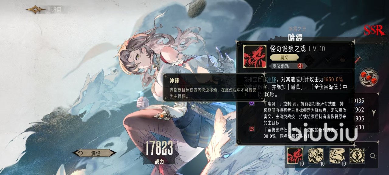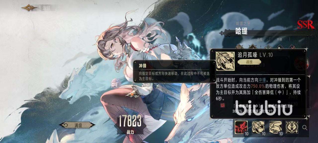 所以被对方攻击后打到残血并不可怕,带来的高额吸血能力完全可以通过自身的输出将血吸回来,所以在续航方面还是非常不错的。他的战技是追月孤嚎,战斗开始时直接向当前方向进行冲锋,冲锋过程不可被选中为主目标,对冲撞到的第1个敌方单位,造成高额物理伤害。并将其设置为攻击的主目标,为其施加全伤害降低效果,使其造成的伤害降低30%,持续6秒钟。