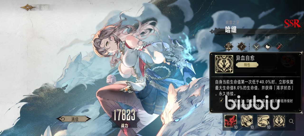 首先是在基础属性方面,哈缇是属于王国阵营的中型角色,他擅长突袭避开敌方前排保护直接去切后排,是近战冲锋型的选手,月相是残月。基本攻击牙拳,可以对主目标造成135%攻击力的物理伤害。有一个特性是异血自愈,自身当前血量第1次低于40%的时候,会立即恢复最大生命值的8%,并获得渴求状态。该状态是永久持续的,在此状态的影响下获得30%吸血,血月降临持续时间内,造成的伤害提升20%。