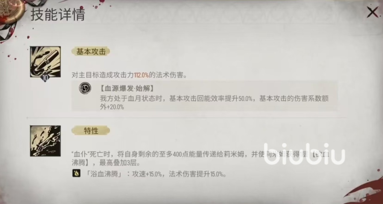 莉米姆的基本攻击可以对主目标造成法术伤害,当我方处于血月状态时,基本攻击回能效率会获得50%提升,基本攻击的伤害系数额外增加20%。所以虽然看似伤害比例比较低,但如果结合上这样的效果,那就很可观了。自身特性是当血仆死亡时,将自身剩余能量传递给莉米姆,莉米姆将获得一层浴血沸腾效果,最多可叠加到三层。