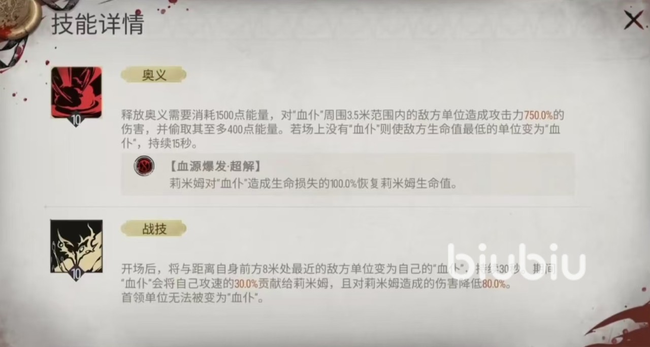 在奥义技能释放之后,对血仆周围3.5米范围内的敌方单位造成750%攻击力的伤害并偷取能量。如果场上没有血仆,得使敌方生命值最低的单位变成血仆,持续15秒。另外莉米姆对血仆造成伤害时,对方的生命损失可以恢复利米姆的生命值,这样就起到了吸血,恢复自身血量。能够对敌方单位进行削弱,并且自身也有很不错的伤害,是这名角色的特点,技能设计也非常有意义,所以很值得大家去深入进行研究。