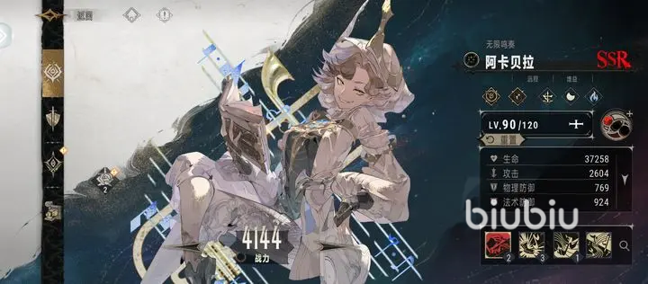 她则是残月月相的T0SSR,虽然也是辅助角色,但是她作为辅助,能力相当的全面,不仅拥有不错的回血效果,还能给队友带来各方面的增益buff,提高攻击力或者防御能力等等,非常均衡的辅助职业,而且技能启动的费用很低,对于队伍的适配性非常的高,必入的角色。普攻对主目标打出一定伤害。特性也非常特殊,会优先获得已经持有的“音符”,拥有3个音符时,消耗音符,并给所有友方单位施加对应类型的增益效果,红色音符可提升队友中等程度的物理伤害效果;蓝色音符提升中等程度的法术伤害;黄色音符小幅度提升队友的暴击率。