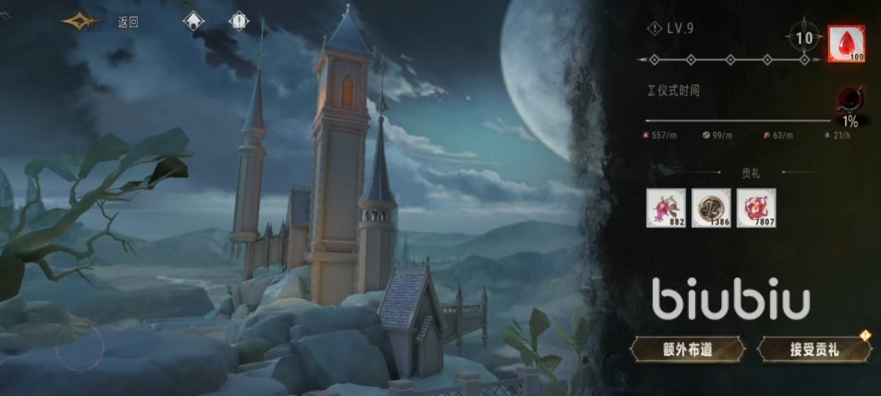 第5项功能是盈月贡礼,在主线中每累计5次通关剧情模式或者是困难模式关卡,盈月信念就能提升一级,然后能提升产出的贡礼数量,每天都可以进行额外的布道,通过额外布道,能够获得两小时的仪式时间基础资源和随机道具奖励。