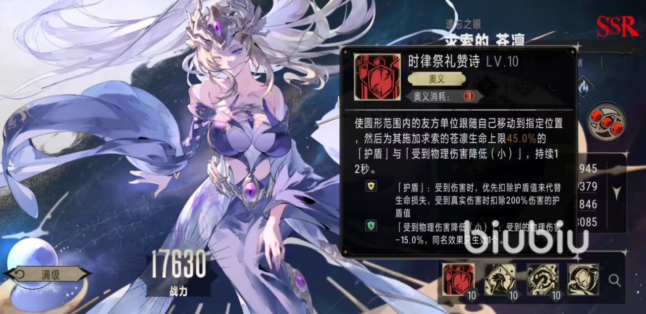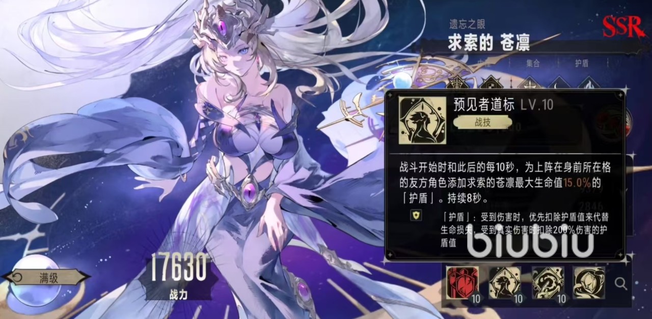 战技在战斗开始和此后的每10秒钟都会释放,为在身前的友方角色添加护盾,持续8秒钟。当此技能达到满级时,会按照求索的苍凛15%的最大生命值来生成护盾,这样大家在阵容搭配的时候就要额外注意,要将需要重点保护的角色放到求索的苍凛身前所在的格,这样利用生成的护盾,可以提供很好的生存辅助。基本攻击可以对主目标造成法术伤害,自身的特性是添加过护盾的单位,都可以获得护盾量提升效果。只要在此效果的影响下,后续获得的护盾,都会有额外的生命值加成。