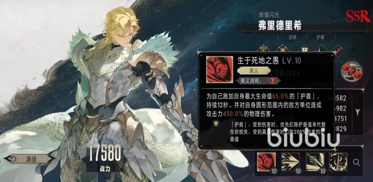 战技每进行4次攻击就可以触发一次,会按照15%的生命值生成一个护盾,持续10秒钟。在护盾持续时,自身的特性王室尊傲,可以提供15%的法术减伤属性,血源爆发能在低血量时提升护盾量。在实战中,弗里德里希就是凭借自身独特的护盾机制和法术减伤特性,可以在团队中承受大量伤害,能够位居目前物理防御型角色的t1梯队。在对抗高爆发法术敌人时,有着非常强的作用,很适合在一些高难度的副本担任主坦,或者是在pvp中充当前排扛压。