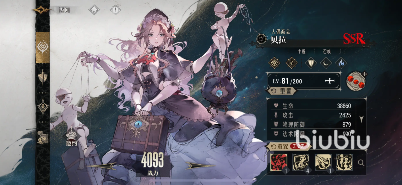 贝拉的基本攻击能对敌方造成不错的伤害,特性的主要效果可对召唤物施加自身最大生命值的治疗效果;战技能够召唤出继承她自己攻击力和防御能力的提线木偶,木偶可以代替贝拉成为主要的承伤对象;奥义技能通过召唤物对所有敌方单位造成高额的群体伤害,并对敌方施加眩晕的效果,还会将敌人的主目标修改为召唤物,会优先对召唤物进行攻击。