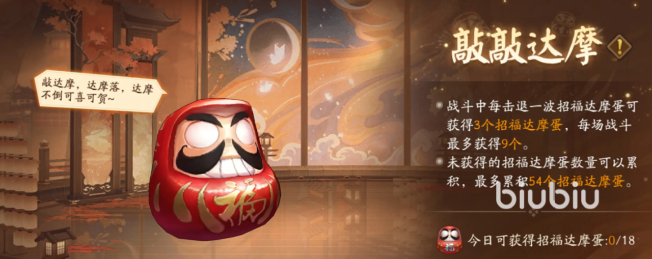 首先第一个活动是悄悄达摩,这个活动在下一次更新之后便可以进行参加。这个活动的参加是需要消耗自身体力的。我们在参加之后需要去击败出现的达摩,咱们每成功的击败一波达摩便可以获取到3个招福的蛋,每一场战斗最多可以让我们获取到9个蛋。这些蛋是可以进行使用或者合成的。