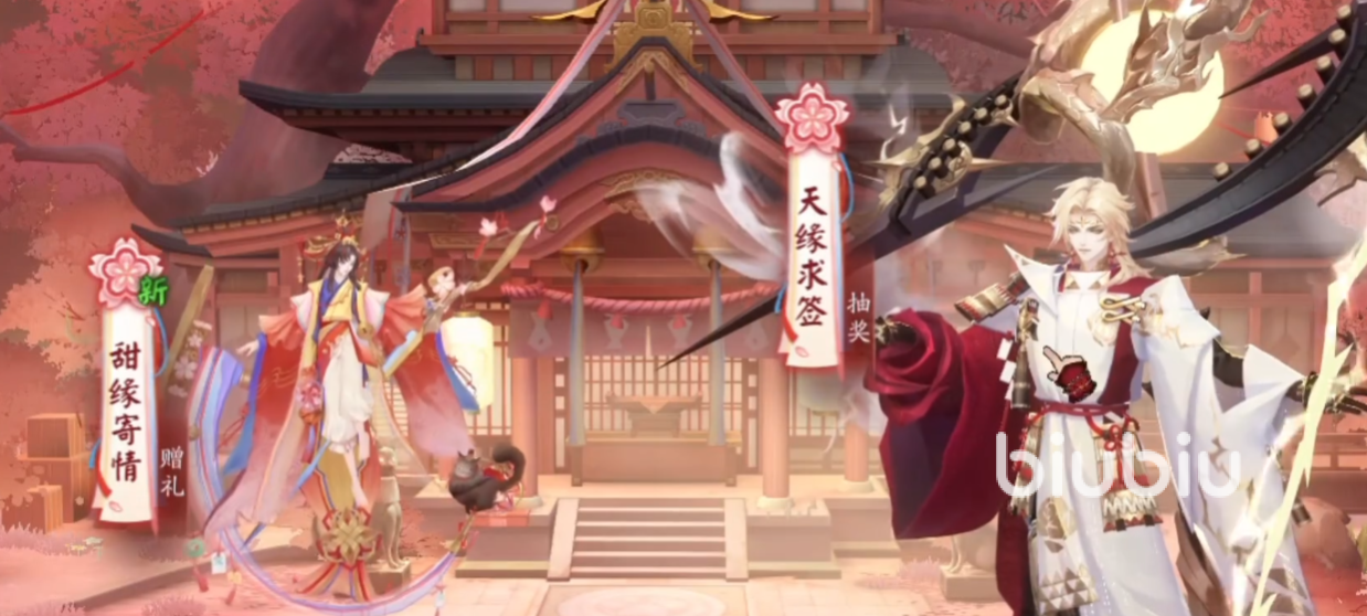 活动期间,可以购买并使用“锦签”来求签,简单说就是抽卡,可以获得结缘樱、御行达摩碎片等奖励。然后用结缘樱在活动商店可以兑换须佐之男和遥念烟烟罗的这两款皮肤,还有对应式神的专属陪伴礼。