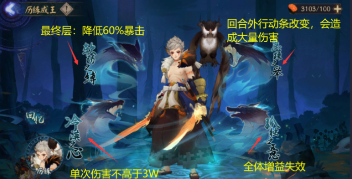 相似月之羽姬的那类中小型爬塔,一共有五层,每一个历练的最后层通过关卡以后都会除掉最终成王模式里山风的1个技能特效。