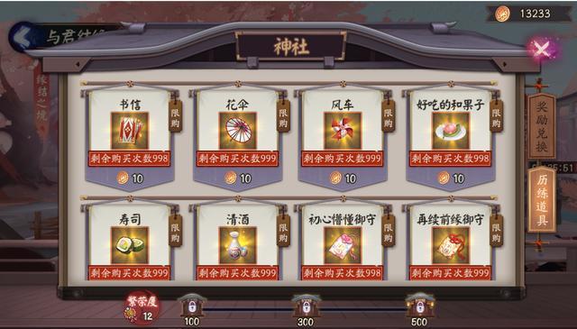 缘结神社是换取游戏道具之处,分为奖品换取和历练游戏道具换取:
