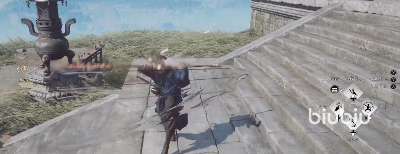 接下来看一下九曲惊神枪的轻击、重击和蓄力技,轻击的效果是挥舞长枪,进行最多四段轻击。重击的效果是挥舞长枪,进行最多三段重击。蓄力的效果是消耗耐力,长枪向前方刺出,对命中的敌人造成四段伤害。另外还具有一个易武技能,就是将当前手中的武器直接切换为长枪,切换回来之后直接进行一次横扫攻击。