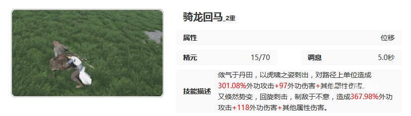 该招式发动起来之后,以虎啸姿态往前方刺出,对路径上的所有单位都造成外功攻击和其他属性伤害,接下来突然改变招式,回旋刺再造成一次更高的外功攻击和其他属性伤害。这两段伤害加起来对单体目标的输出是非常恐怖的,非常适合攻击一些单体状态下的敌人。这也是现在很多玩家都在使用的单体骑术,因为它确实非常好用,只需要消耗15点精元,冷却时间也非常短,可以造成总共高达668%的外功伤害。